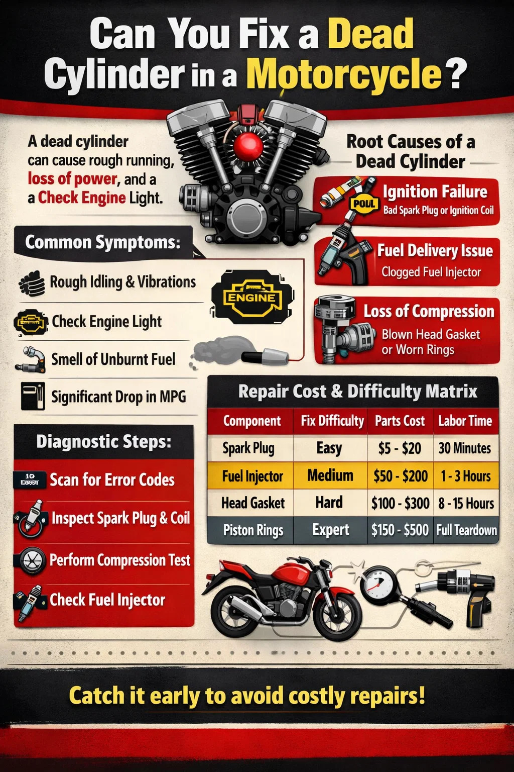 Si scintilla obturaculum inquinatum est vel coitus ignitio defecerit, mixtio in illa specie motorcycle cylindrici non accende. Reposito scintillae obturaculum est solutio communissima. Si gyrus mortuus est, illud cum gyro e cylindrico laborante permutando est magna via ad probandum si "mors" ad novum locum moveatur.