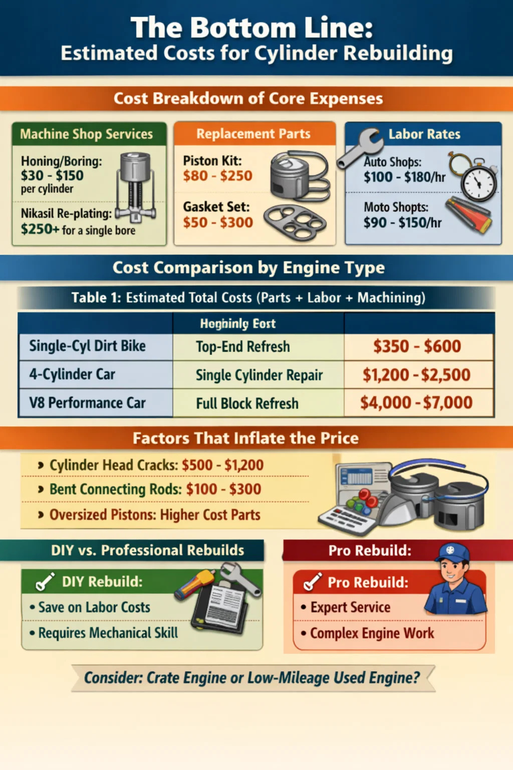 Sumptus ad reficere cylindrum plerumque iugis a $500 ad $ 1500 per cylindrum ad eget tormenta, dum singula motorcycle cylindrici saepe refici potest inter $ CCC et $ DCCC . Hae figurae bacchantes variantur secundum utrum "summum-finem" agas (anulos et gasketes) vel plenam restitutionem mechanicam quae habent taediosam, honationem et pistores oversizatos. Si teipsum demoliri facis, signanter in labore servare potes, quod typice rationem reddit LX% ad LXX% totius cautionis.
