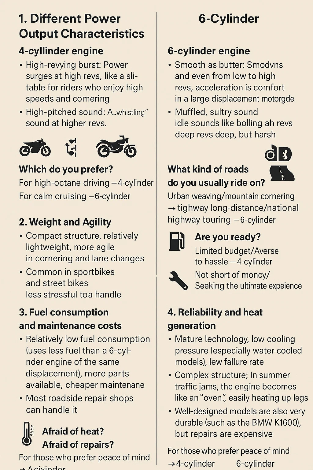 Eligendo inter 4-cylindricum et machinam 6-cylindricam pro motorcycle pendent a praelatis usu et stilo. Hic comparatio: