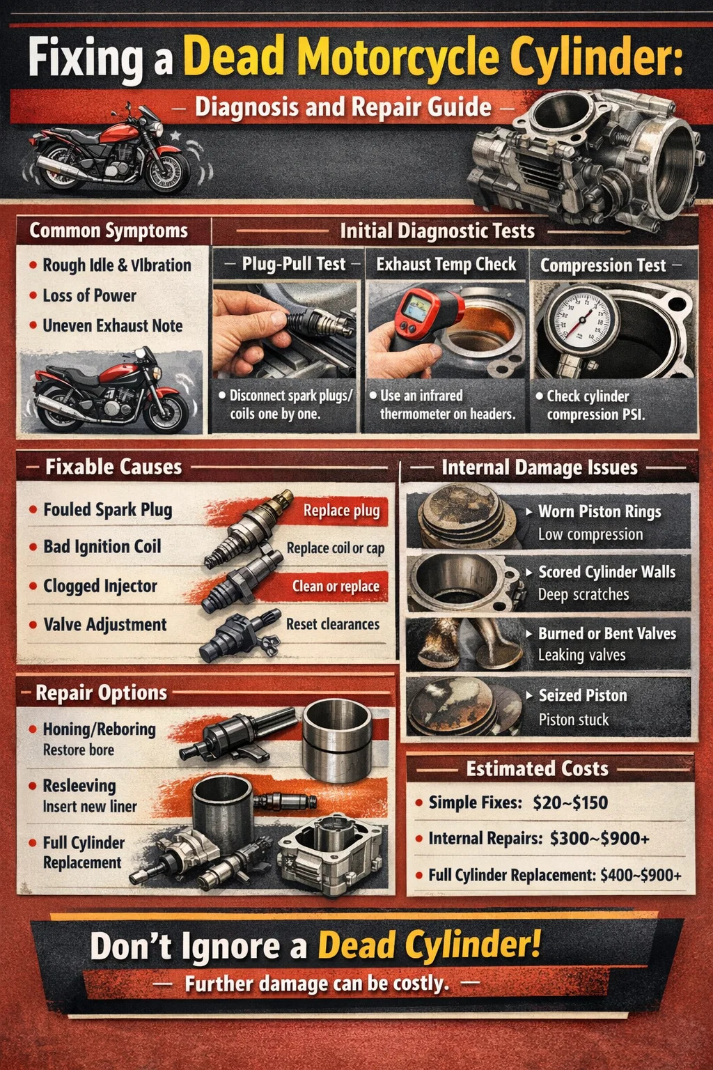 Cylindrus motorcycle mortuus ob obturaculum scintillae foedae, injectoris escae impeditae, coil ignitionis defecit, vel minor valvae temperatio exitus ad vitam reduci potest cum reparationibus simplicibus et arcubus relativis. In altero spectri fine, columpna quae foedum sustinuit, dolium rimae, pistonum comprehensum, vel anulum grave indumentum, opus mechanicum magis implicatum requiret — incluso cylindrico potentiali reposito vel renascendo. Punctum est "cylindricum mortuum" diagnosis unica non esse. Indicium est quod ad multas causas causas diversas reducit, unaquaeque portans suum iter et sumptus reparando.