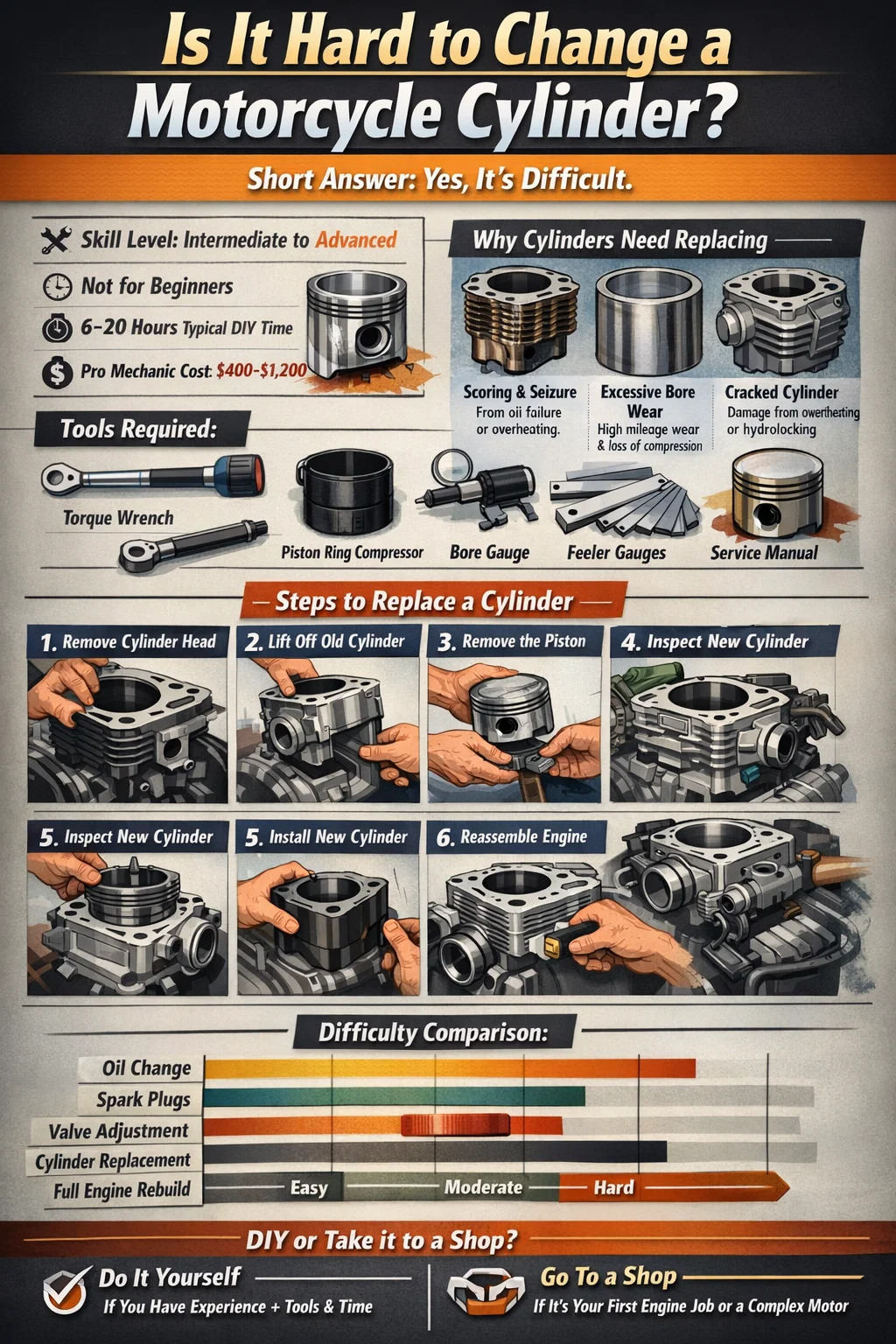 Ut machinas motorcycli unius cylindrici maxime, primum DIY cylindricum repositum, plenam volutpat operis focused capiet. Hoc idem officium ad tabernam motorcycle competentis perficiatur in die et constaret $600 ad $2,000 fretus partes et labo- rales. Decretum tandem descendit ad fiduciam in propria praecisione, tempus quod habes, et periculum oeconomicum si quid siet absorbere vis.