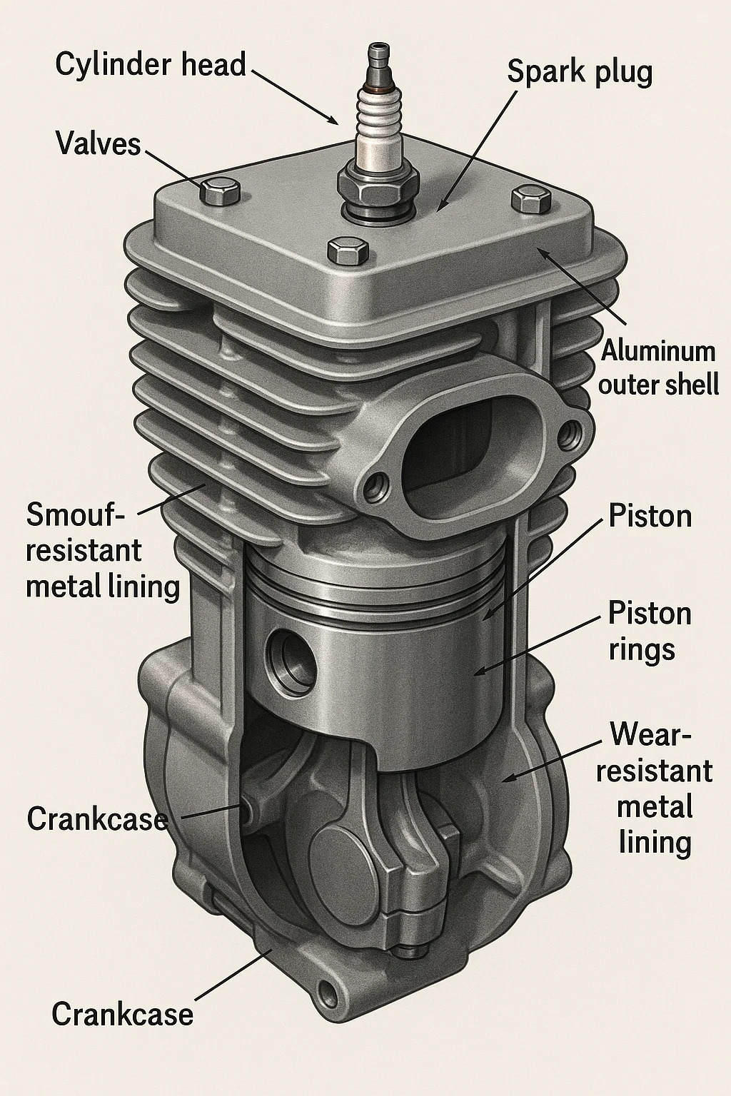 Vulgo habet aluminium crustae (levore dissipationis caloris rapidi), cum linitione metalli resistente intus (ut nickel-silicon vestiens vel lineum ferreum) ne togam piston.