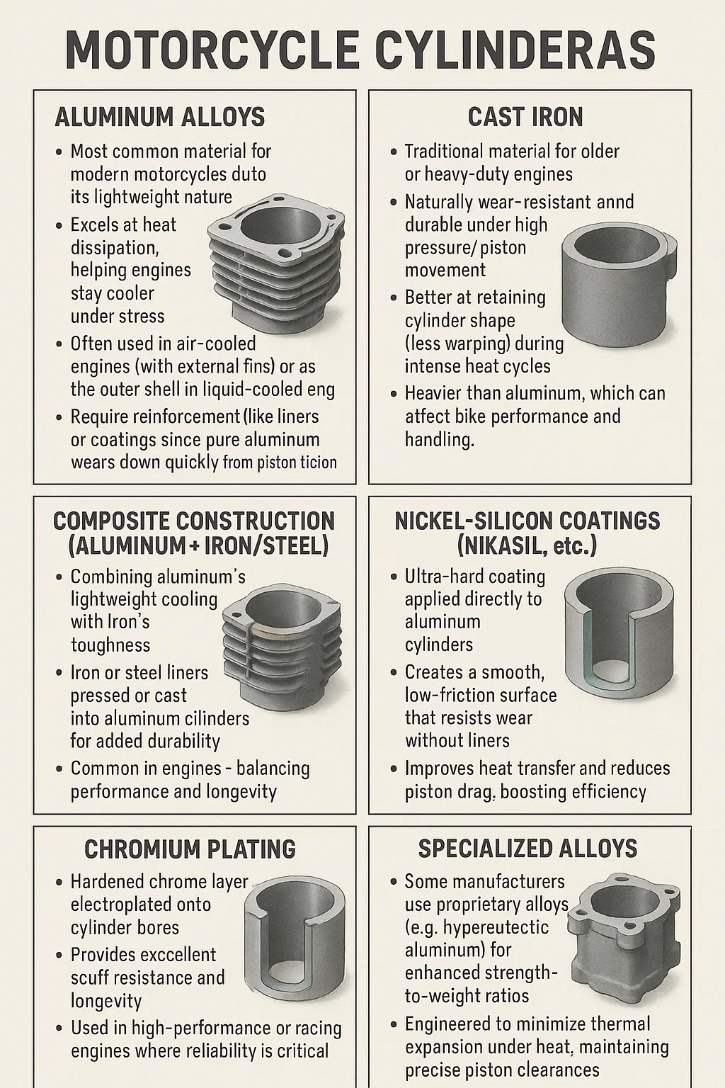 Motorcycle cylindrici principaliter fiunt ex metallis ad fortitudinem, ad tolerantiam caloris, et ad vetustatem. Hic est singulare naufragii materiarum communis et earum notarum: