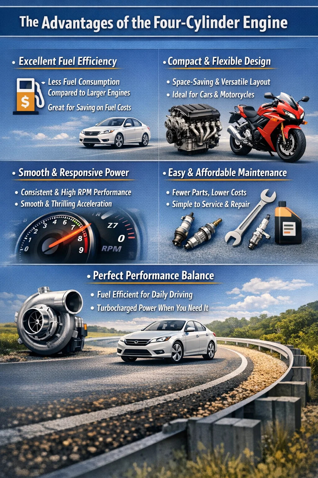 Ad tormenta comparata cum pluribus cylindricis (ut sunt machinae sex cylindricae vel octo-cylindricae), machinae quattuor cylindricae partes pauciores et frictionem internam minus habent. Hoc modo non necesse est ut resistentiam suae operationis superent, superflua nutrimenta consumunt. In hodierno mundo fluctuantium alimentorum pretia ac magis severiora environmental requisita, haec proprietas fuel-eficiens efficit potiorem electionem plurium carrorum familiarium.